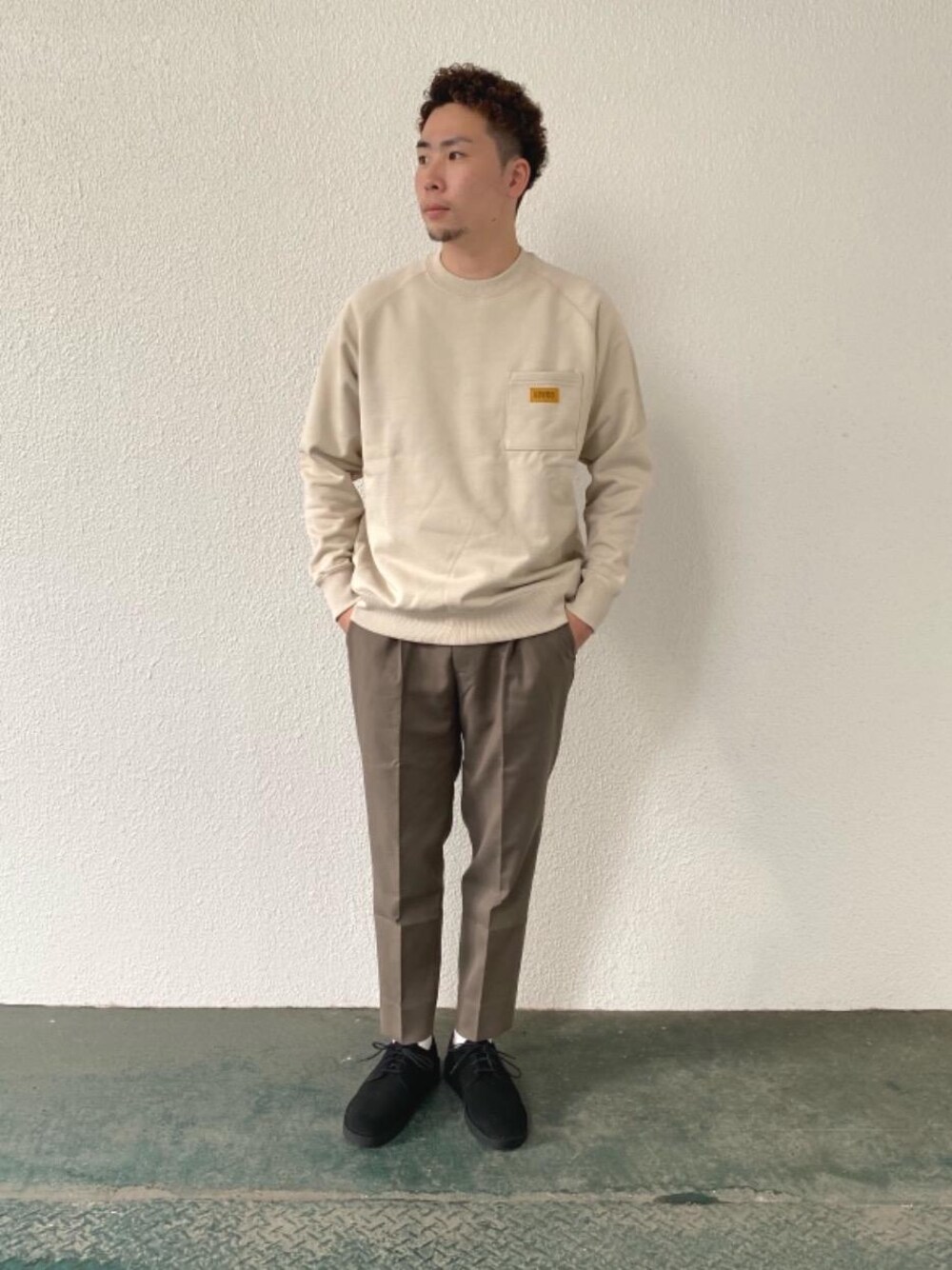 クセのないシンプルなデザインの〈Clarks DESERT LONDON〉を中心にスタイリングを組みました。シンプルなデザインなので、パンツもスッキリとしたアンクル丈のパンツを選び、トップスはゆとりのある〈UNIVERSAL OVERALL〉のスウェットでまとまりのある大人カジュアルをイメージしました。
