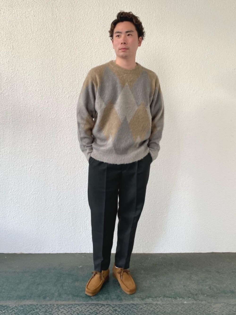 今から冬まで着用できるモヘアのニットと落ち着いた色味のパンツを合わせて、大人のカジュアルスタイルを意識しました。
