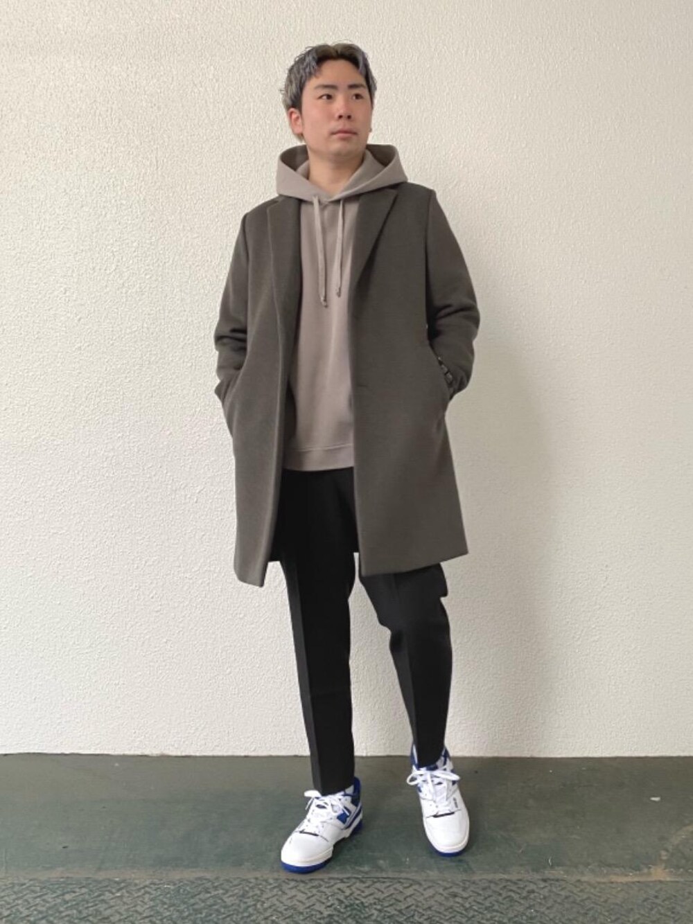 クリーンなチェスターコートにあえてパーカーやスニーカーなどスポーティーなアイテムと合わせてカジュアルミックスなスタイリングを意識しました。パンツもテーパードの効いたシルエットですのでスニーカー合わせオススメです。