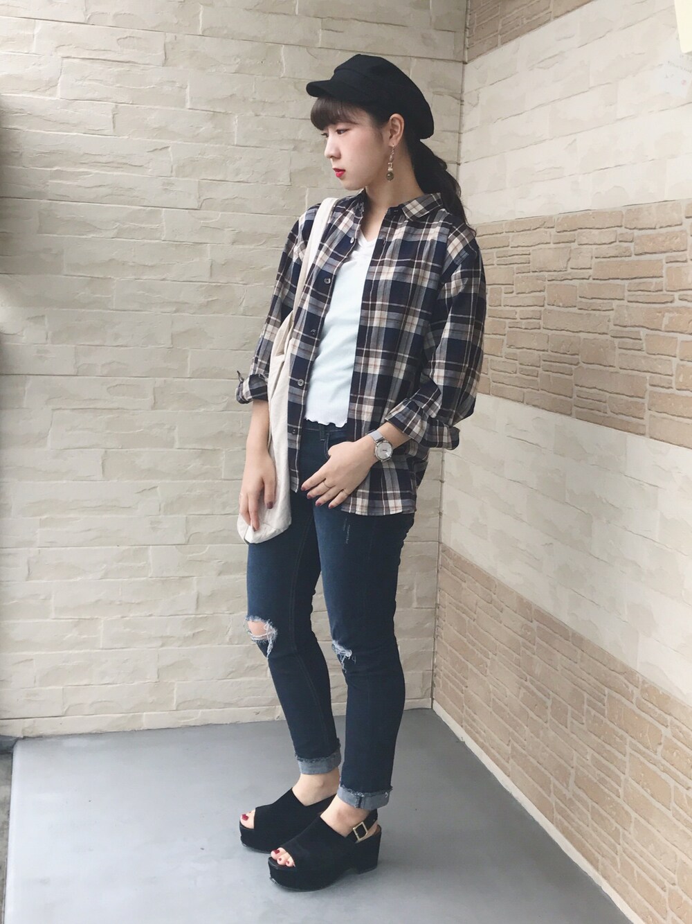 ○休日コーデ○ 前回チェックシャツを可愛いくコーディネートしたので今回はカジュアルなコーデをしました! チェックシャツ×スキニーパンツで簡単なコーデですがキャスケットでお洒落感をプラスしました✨ 簡単なので是非やってみてくださいね❣️