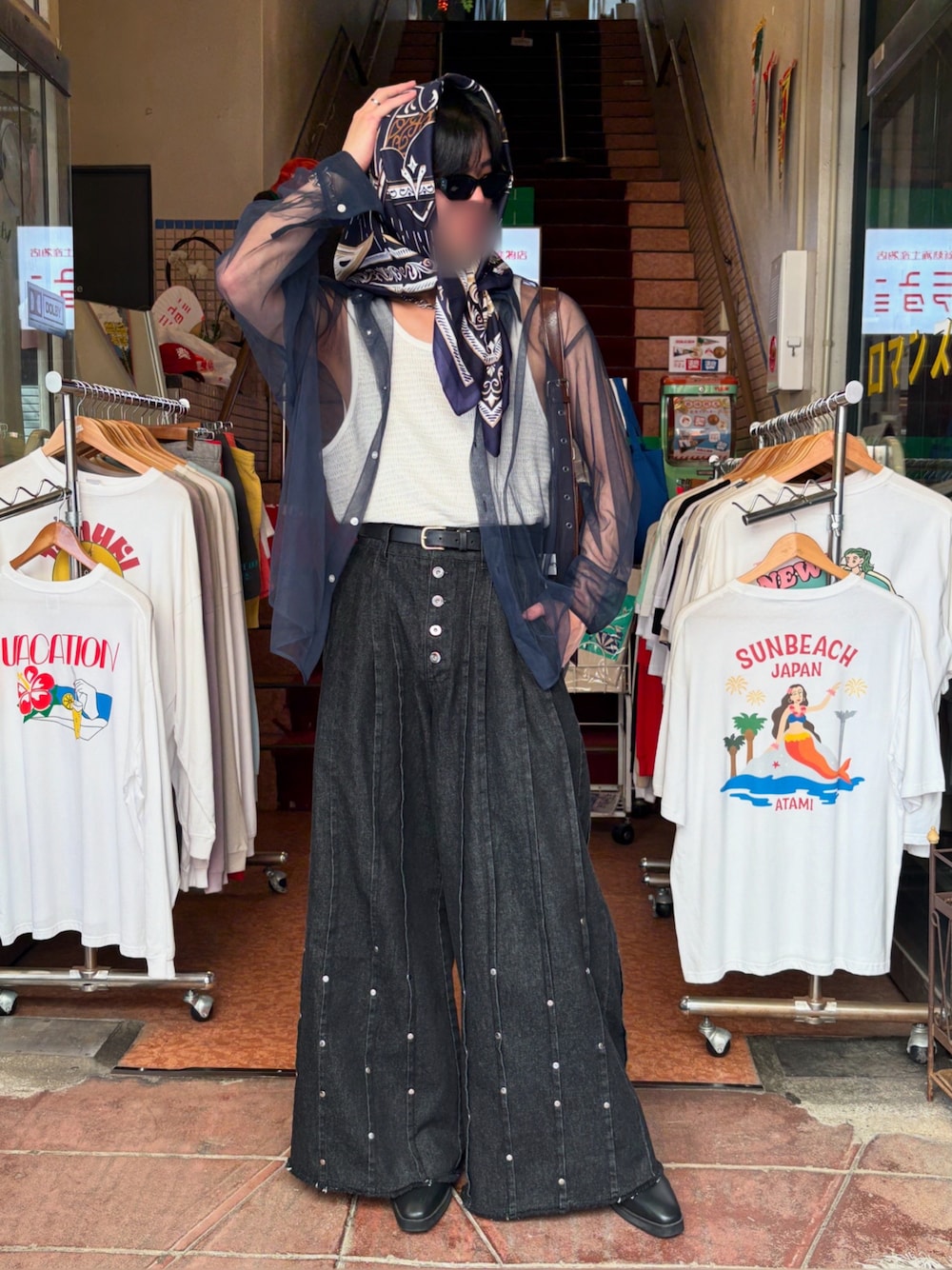 上は青で固めて、下に行くにつれて黒でまとめました! ジェンダーレスファッションがしたかったので、ブーツを履いてます!