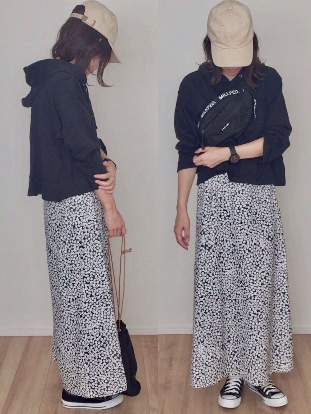 秋も履きます花柄スカート🌼 この黒色パーカーは色違いも欲しいくらい着やすくて合わせやすい◎