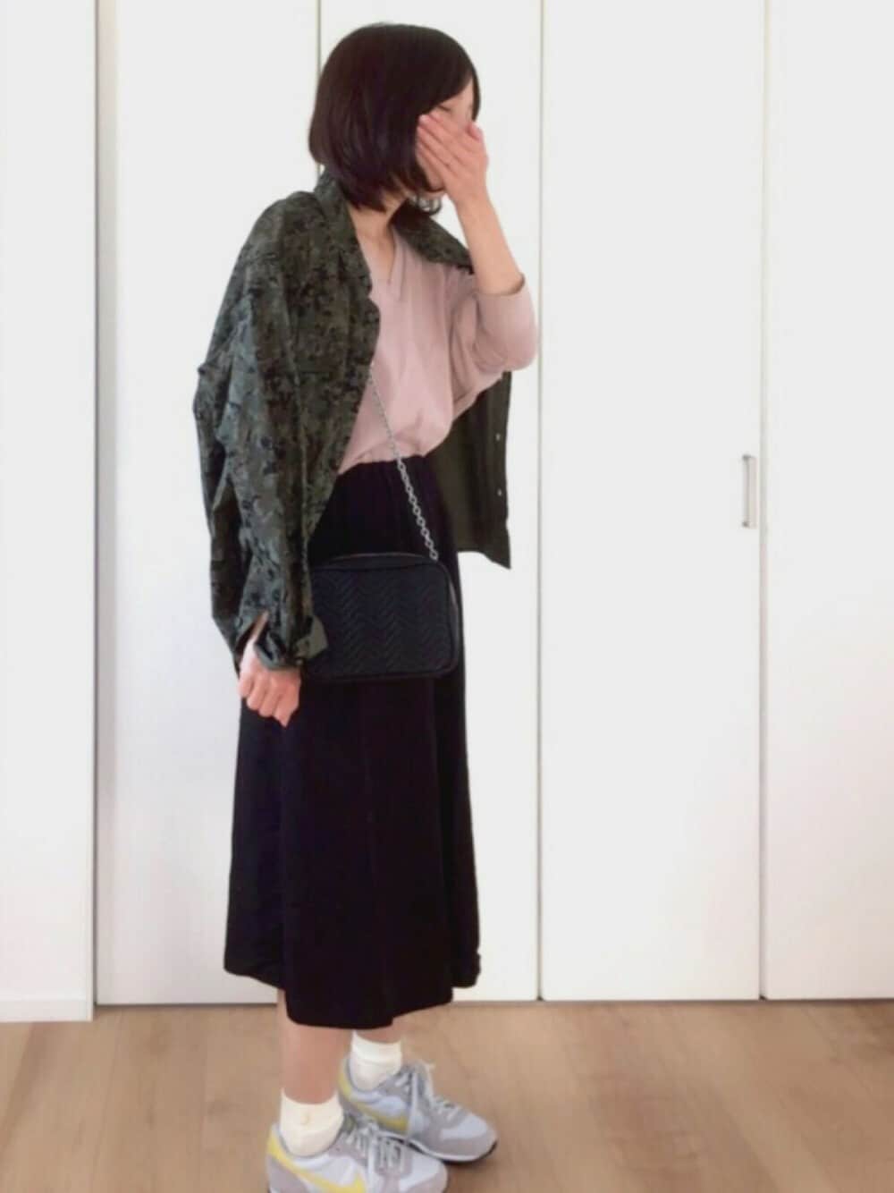 上下ニコアンドさんのコーデになりました(*^ω^*) むかしからニコアンドさんの洋服大好きです! このくすみピンクのトップスはお気に入りでほんとに買ってよかったな…としみじみ♡✨ ピンク×ブラックで少しおとなっぽく(?)なればいいなと思いました。 靴下は靴下屋さんのものでワンポイントの三日月マークがあります🌙 くつした今まではそんはに気にしてなかったけど最近目がいってしまう👀♡ GUさんのカモフラシャツははおってないバージョンもなんとなくのせてみました。