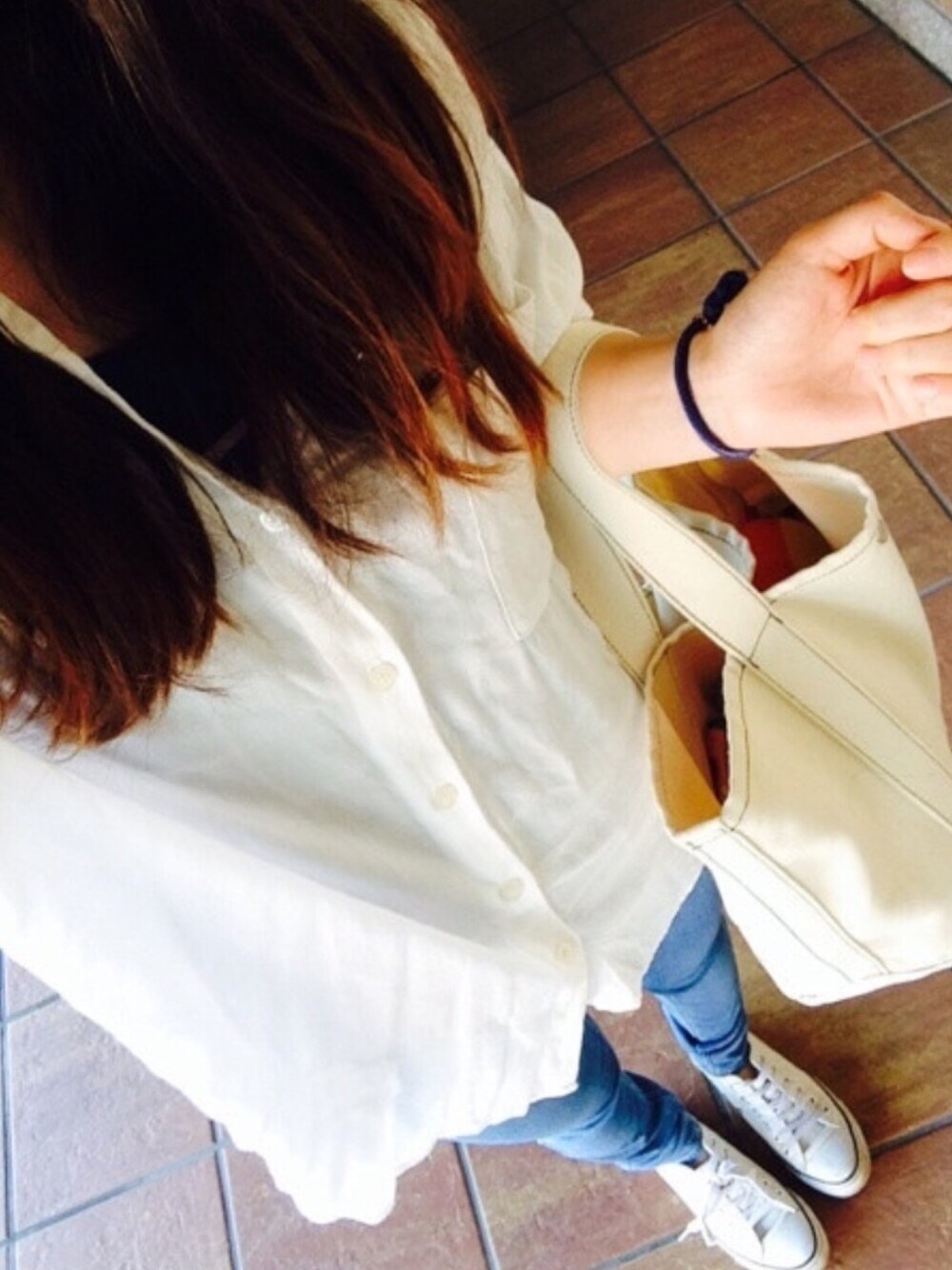 ホワイト系のシャツ/ブラウス、ブルー系のデニムパンツを着用したレディースの夏コーディネートの1枚目の写真