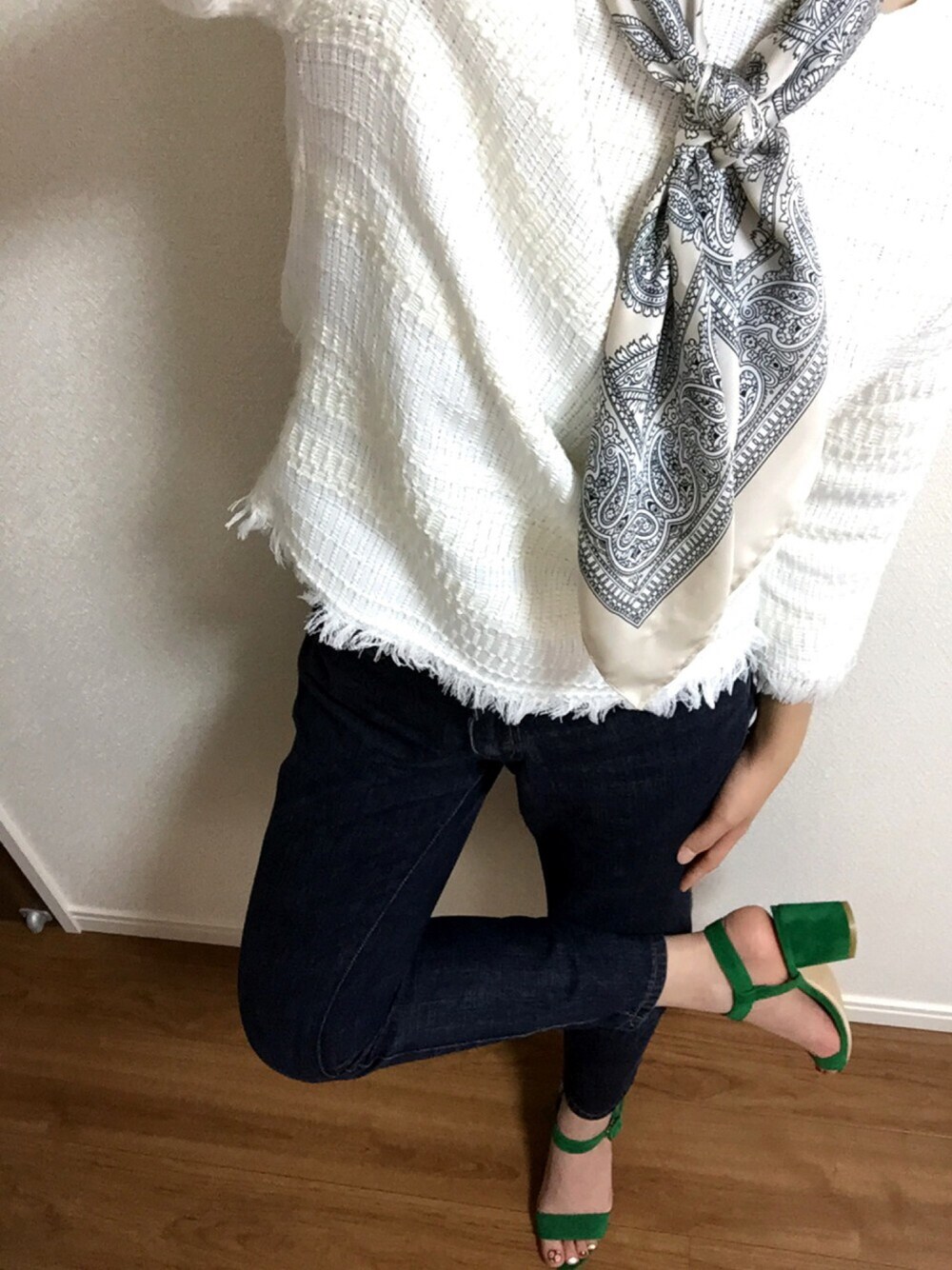 いろいろありまして久々すぎる投稿🙌 人生いろいろありますねー。 みなさんは落ちたときどうやって 上がっていってはるんかなーって、 そんなことばっかり考えてる毎日。 気分を上げるためにネイルを赤にして 好きなお花かいてもらった🌼❤️ 仕事上、手には出来ないから足だけだけど。 このZARAのトップスはツイード生地で 綺麗めだけど袖と裾がフリンジになってて カジュアルさがプラスされてる感じが とーってもお気に入り😋♡♫ ボトムスがデニムだからカジュアルに なりすぎないように流行りのバンダナは テロテロ生地のものにして足元はヒール^^