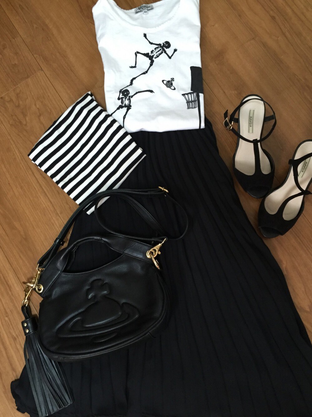 モノトーンコーデ♡ Tシャツの中にはうっすら見えるように ボーダー柄のキャミソールをイン😋