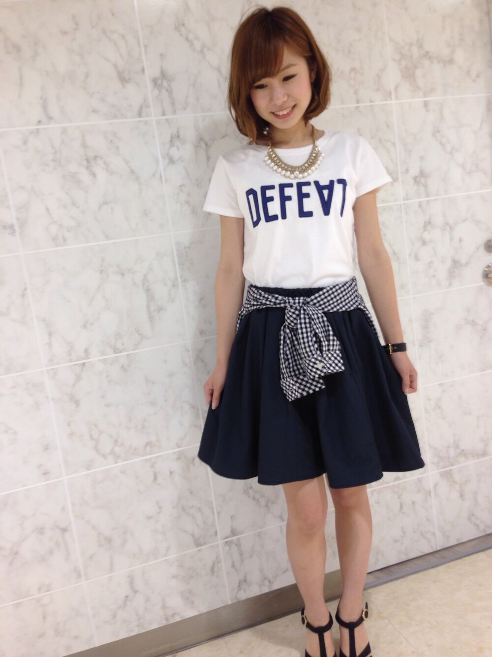 可愛らしいフレアスカートに あえてTシャツをあわせることで カジュアルに仕上げました(^ω^) 腰に巻いたギンガムチェックシャツ がアクセントになっているところが ポイントです☆