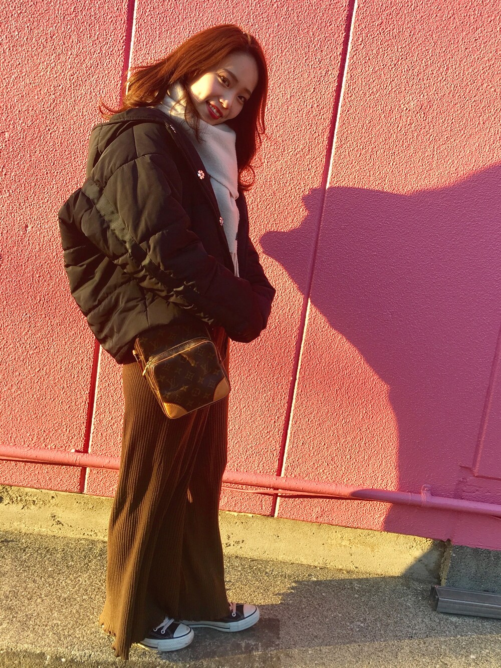 ピンクの壁の背景、、(笑) ダウンは安くて形が可愛くて あったかくて愛用してます🐶💓 ニットパンツにスニーカーに 楽チン休日コーデ✌︎