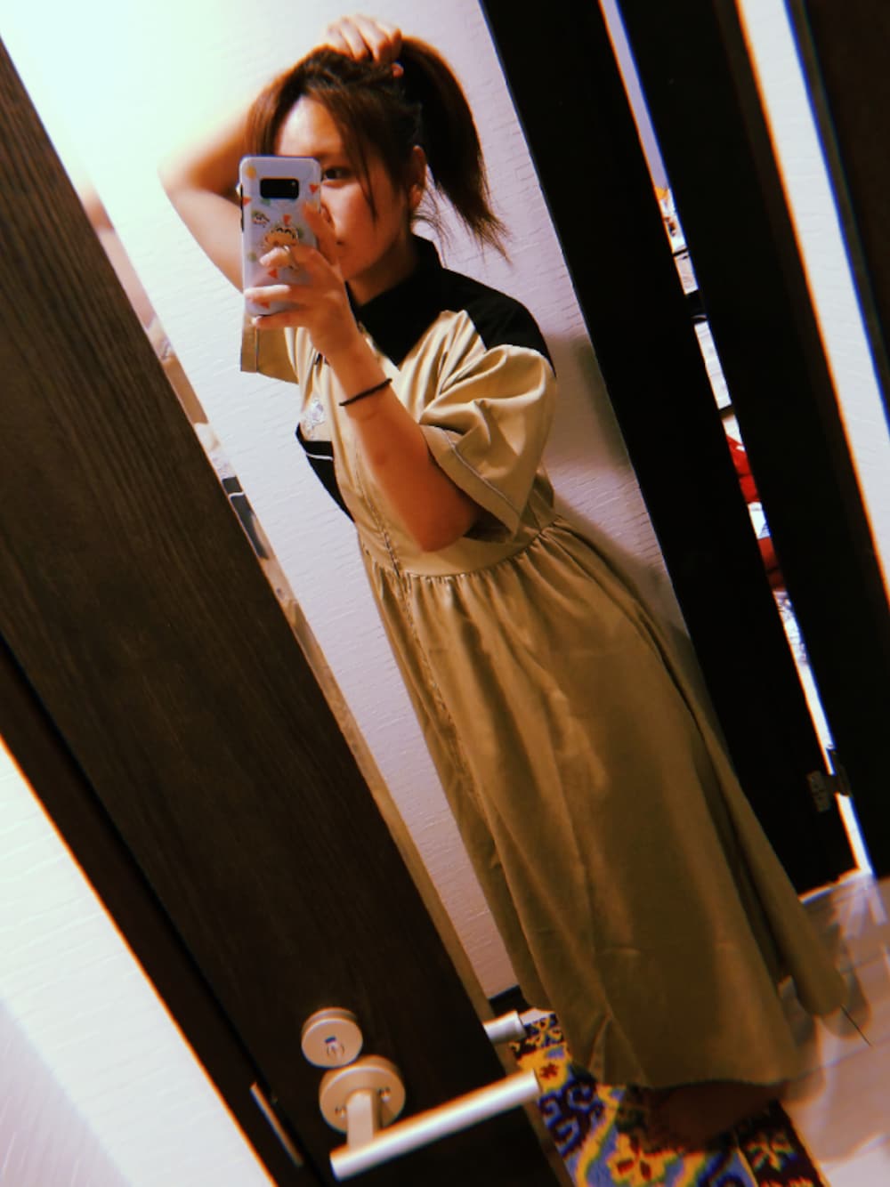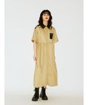 ベージュ系のワンピースを着用したレディースの夏コーディネートの1枚目の写真