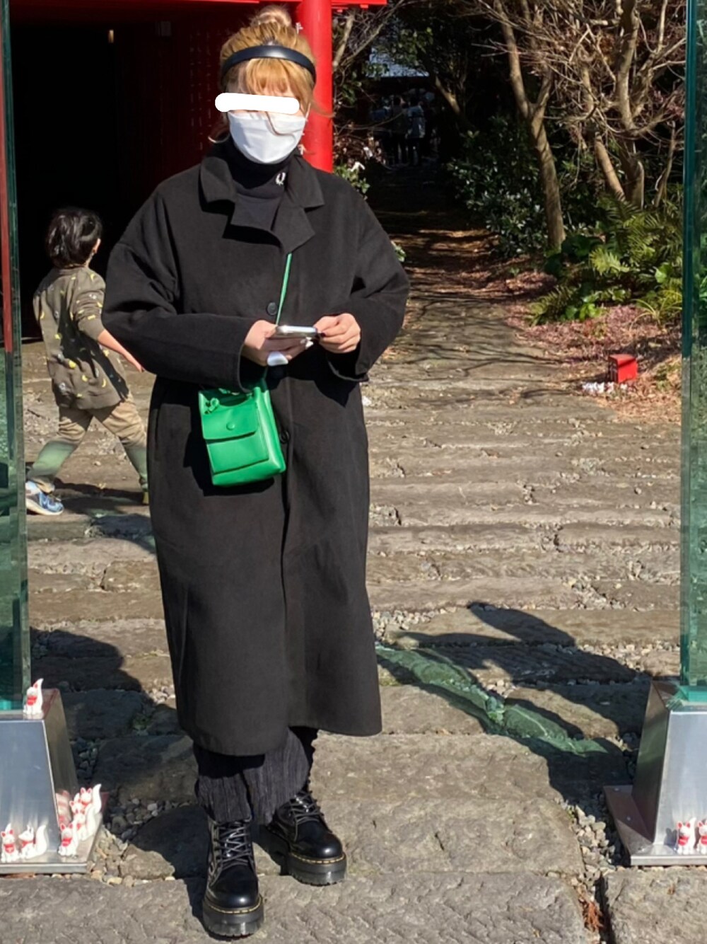 ブラックコーデ 🖤🏴🎱🐈⬛🖤 差し色にグリーンのショルダーバッグ🐊 コートはセールしてて3000円代で買えた〜♪♪