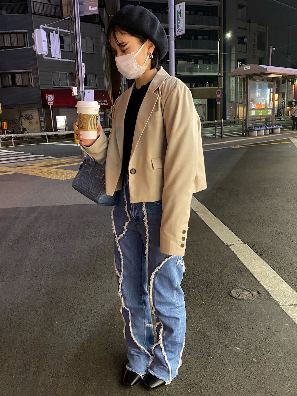 moyuのデニムパンツ「PATCHWORK HW FLARE」を使ったコーディネート