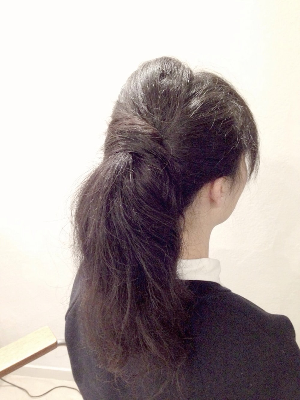 マンネリしやすいポニーテールもねじると雰囲気が変わります ********************* 1.髪を左右にわけてわけた右側を結ぶ 2.左側をねじりながら右側の結び目をかくすようにピンでとめる 3.バランスを見ながらトップにボリュームを出すためひっぱる ゴム1本アメピン1本で簡単に出来ます(^^)