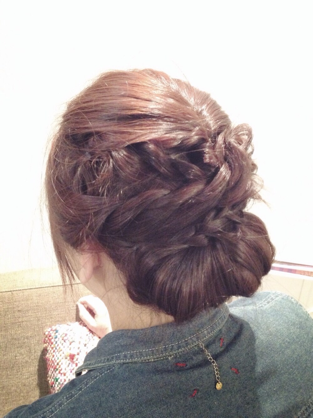 今季流行りのオレンジベージュ 1.トップはボリュームを出す 2.両サイドはロープ編みでねじねじ 3.残りの毛をまとめ、毛先近くで結び、毛先が出ないように丸めて止める ボブ〜ロングの人用 カジュアルスタイルからパーティーまで幅広く使えます
