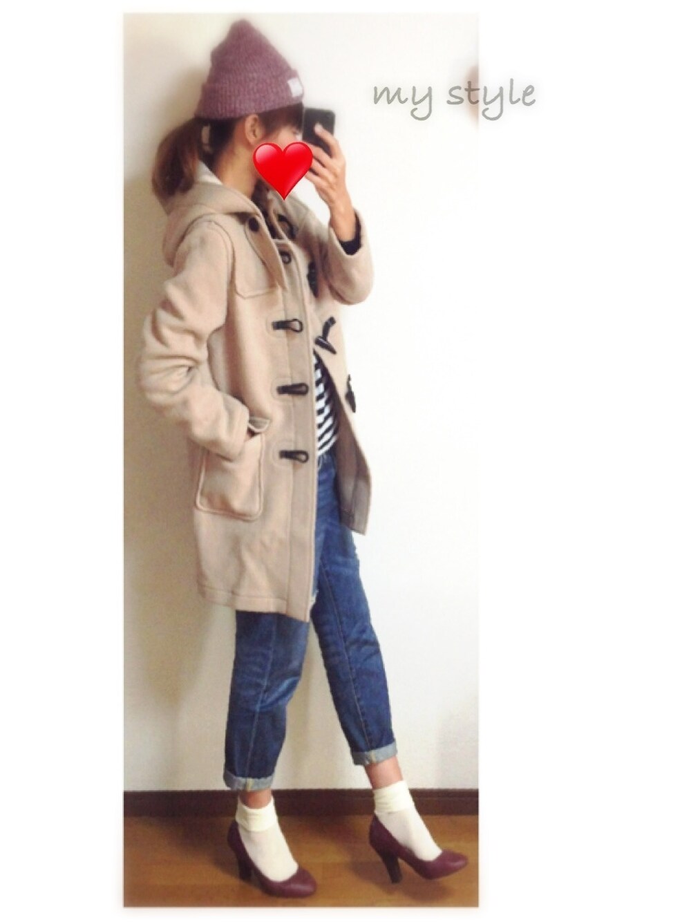 ニットキャップ…glory crew いつか古着屋で買ったこのダッフル、 タグ付き古着(˃̴̀ᄇॢ˂̴́ ∗)੭᷅ʊʊ ホワイトベージュのダッフル欲しかったんだよね❤