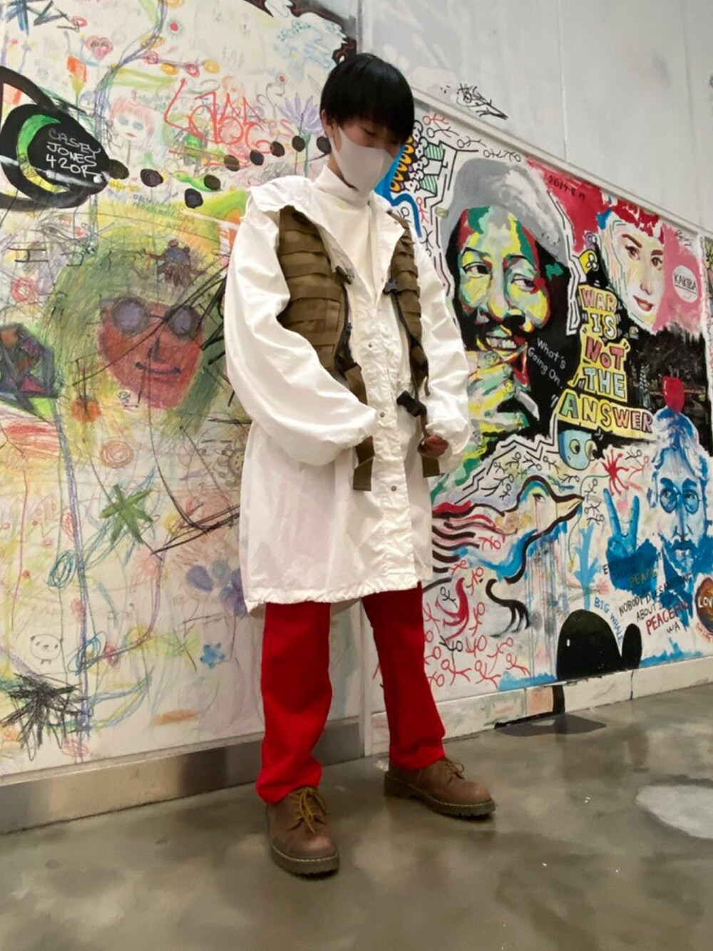 スノーパーカーにタクティカルベスト着て赤のコーデュロイのズボン着た!色合い可愛い😍