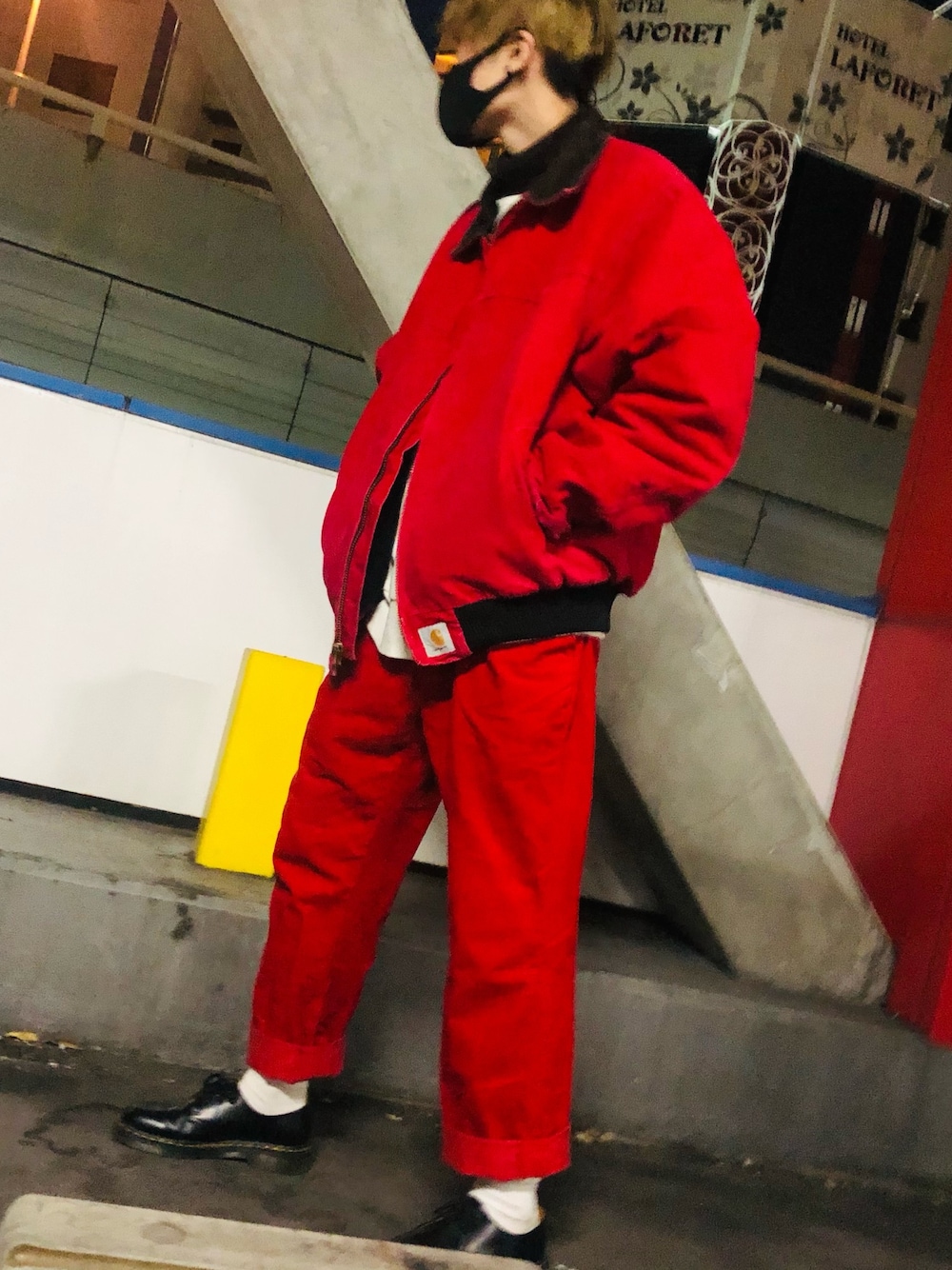 carharttの赤のセットアップ風 サンタさんコーデ