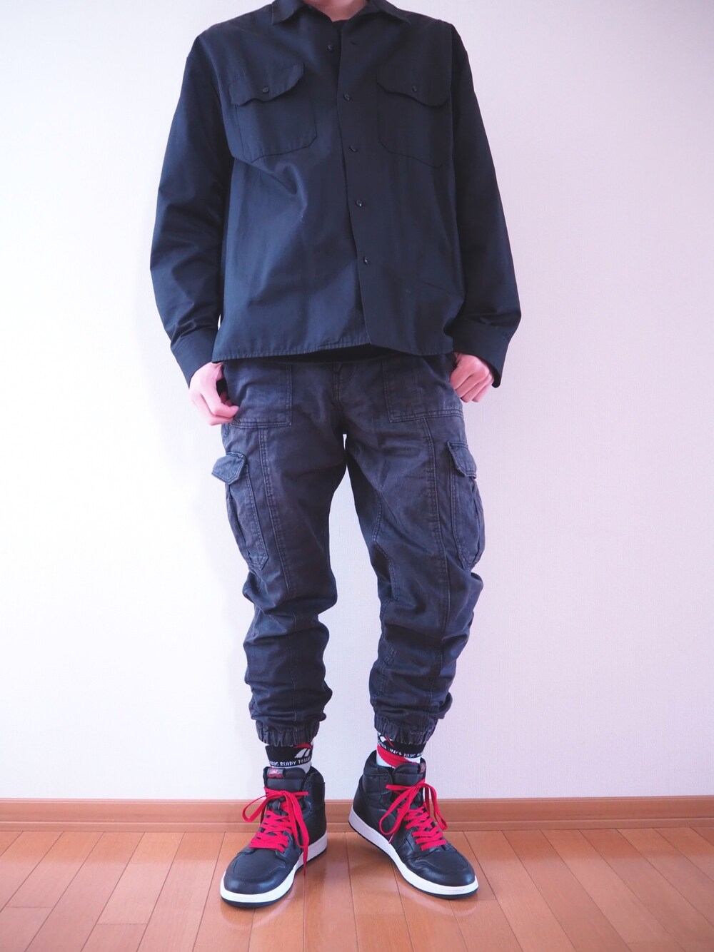 【ハイカットスニーカーの履き方】 今日はAIR JORDAN 1を履きました👟 実は僕自身、ハイカットスニーカーは裾がめくれてしまったり、下手すると子供っぽい印象が出てしまい苦手です。 ですが、ジョガーパンツに合わせる事でストリートテイストなコーディネートが可能です! 更に、足首を少し出してソックスを見せるとスニーカーがより大きく見えるので脚長効果が期待できます!! 是非ハイカットスニーカーにチャレンジしてみてください!