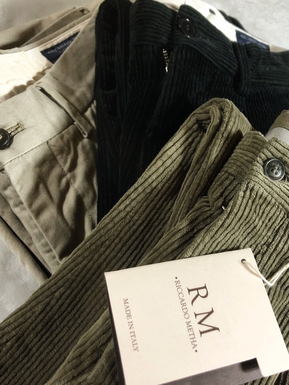 ヘビロテしているRICCARDO METHAのワイドチノ。 今シーズンに、コーデュロイバージョンのブラックとベージュも仲間入り。