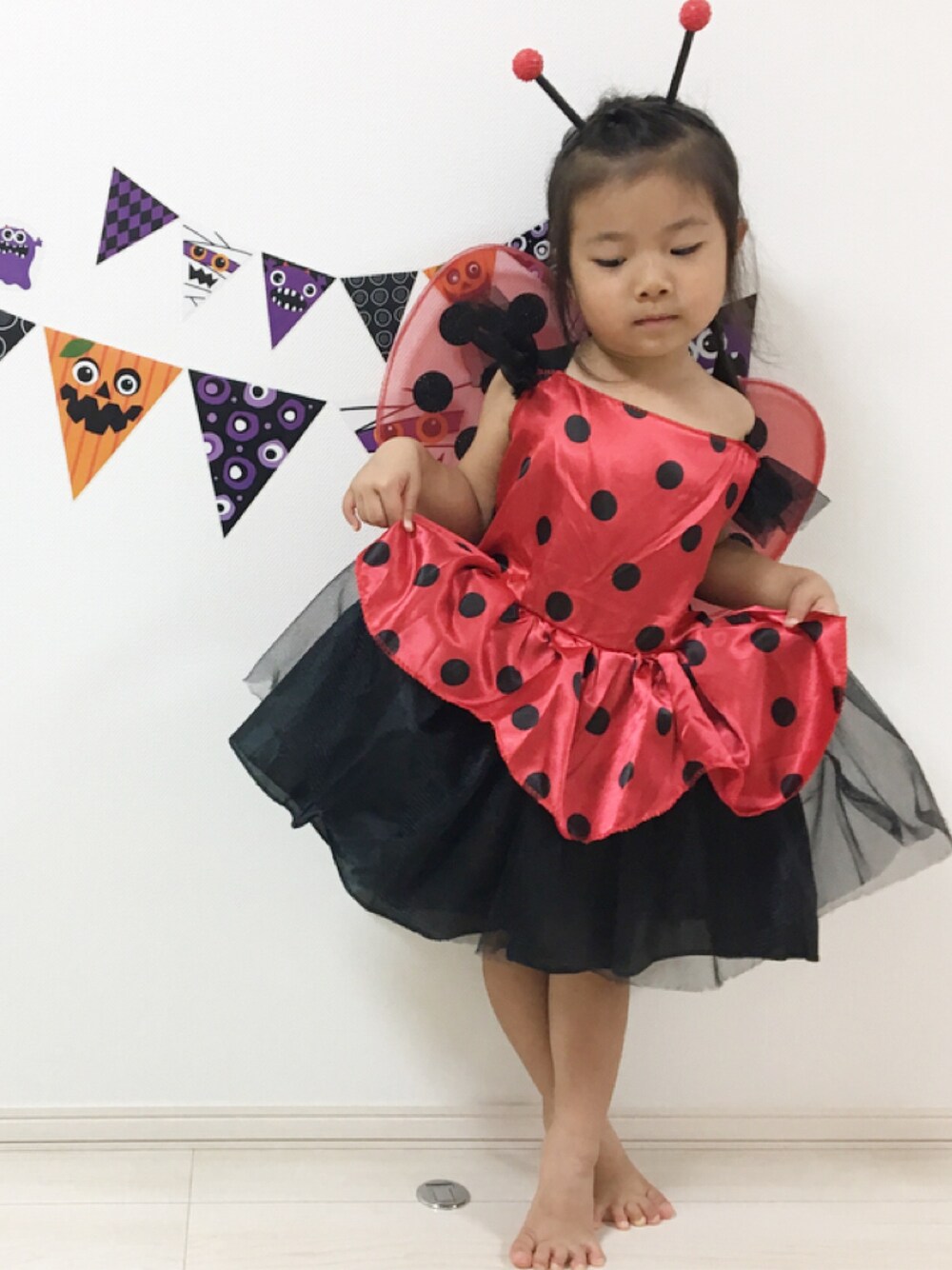 👻🎃HAPPY HALLOWEEN🎃👻 長女ちゃん虫さんに仮装しました✨ 虫さんプリンセスだぁ~と大喜び❤ このドレス何年も前にグアムで購入したもの!! ハロウィンセールで3ドルくらいで購入したんです😳 日本にはなかなかないデザインで気に入ってます✨
