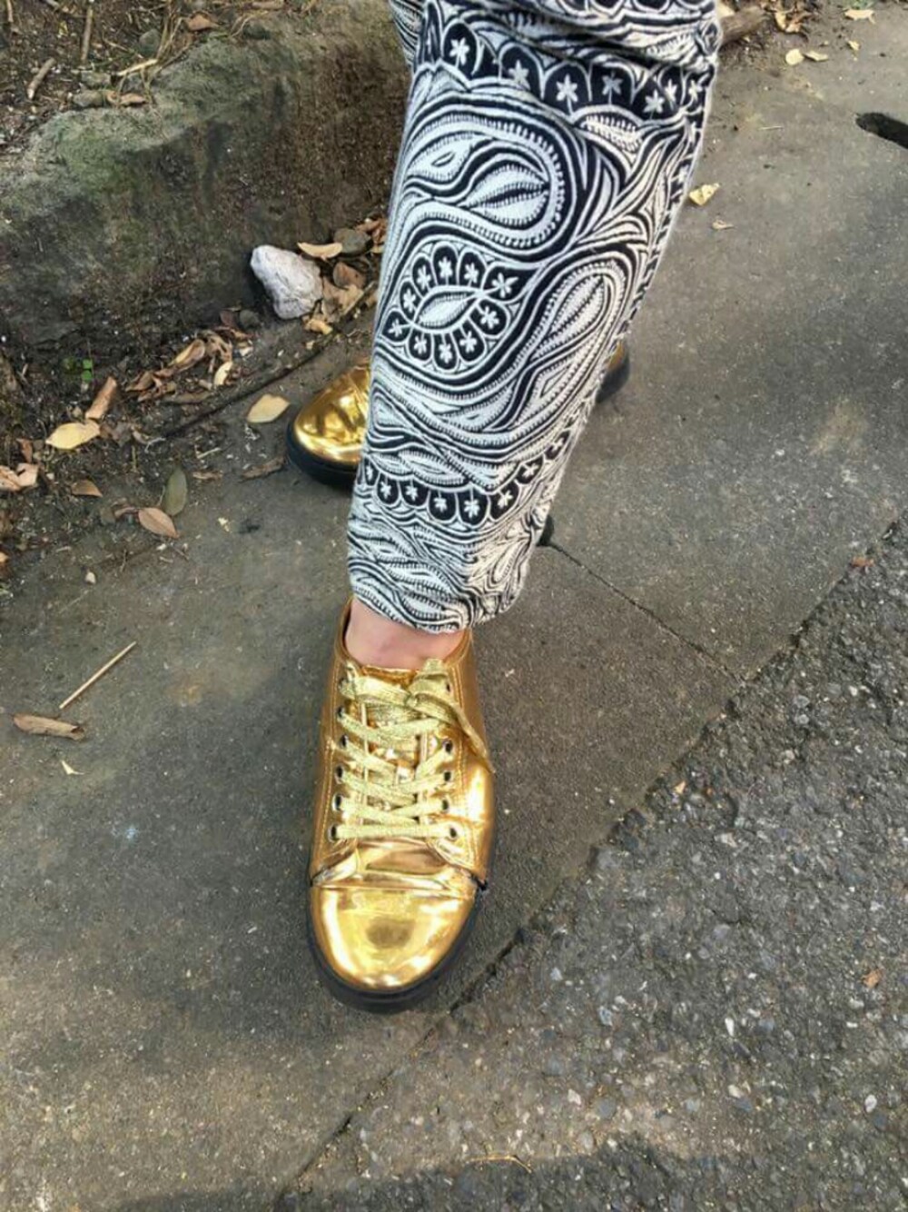 ペーズリー柄のパンツにミッドウエストのスーニカー