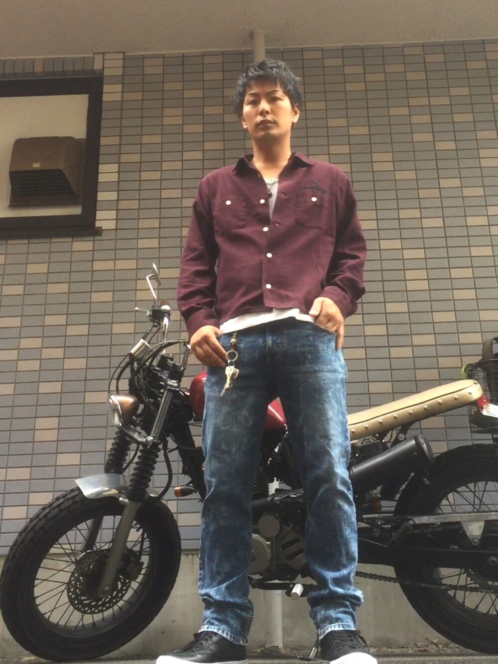 テンダーロインのシャツは親父からの貰い物です。 キムタク意識の親父からの貰い物です。 毎日バイクに乗るから良い靴だとすぐ傷めちゃうんでリーズナブルな靴ばっかり履いてます。 シャア・アズナブルではありません、リーズナブルです。