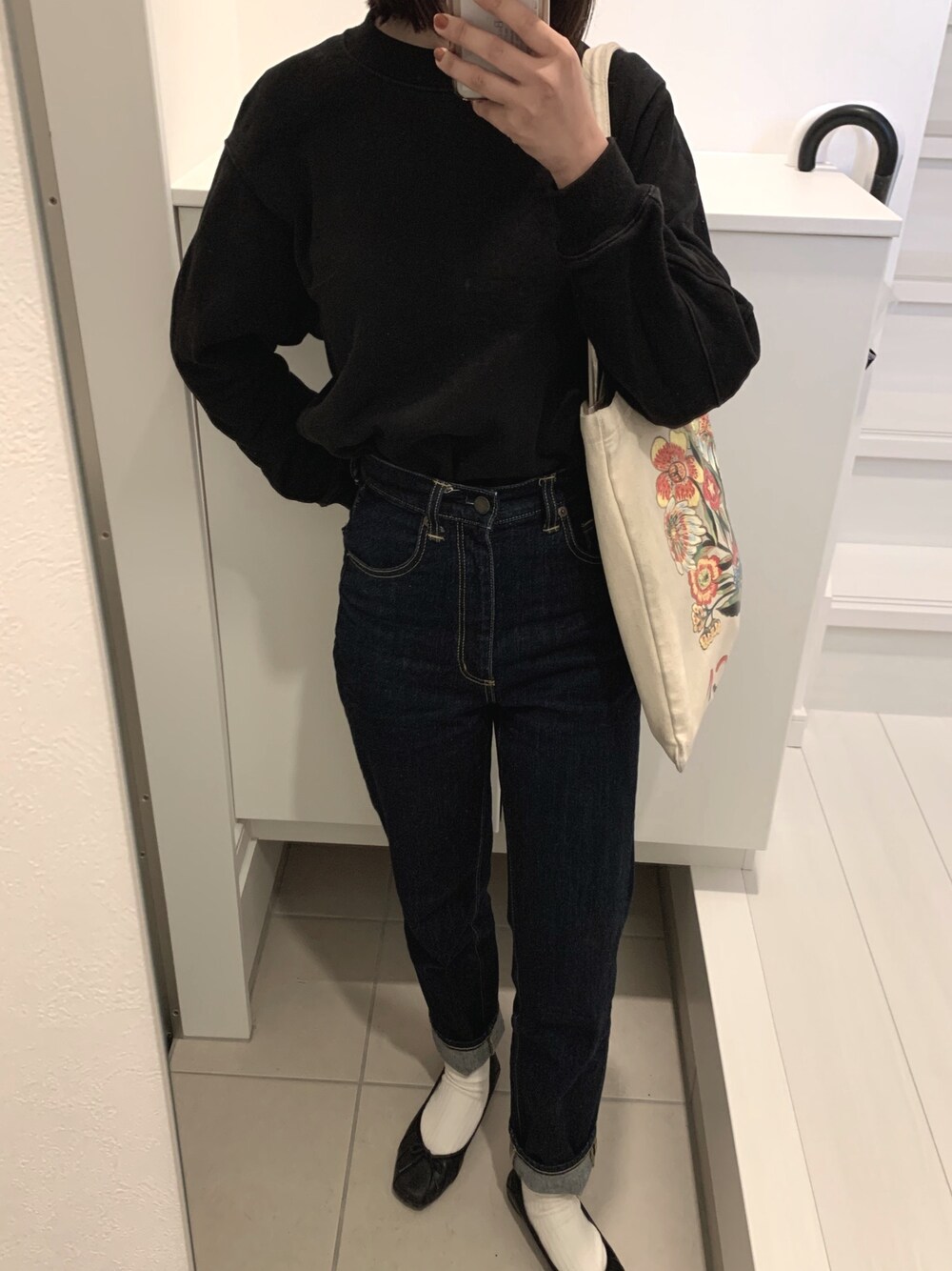 ブラック系のスウェット、ベージュ系のトートバッグ、ブルー系のデニムパンツを着用したレディースの春コーディネートの1枚目の写真