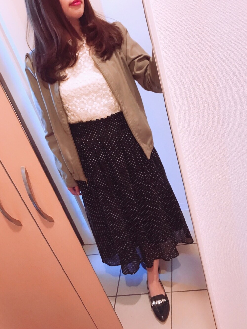 水玉スカート着まわしコーデ 台風に備えて食材買い込んで来ました🥕 迎え頼まれたけど大荒れすぎて辿り着けるか不安です(・~・)