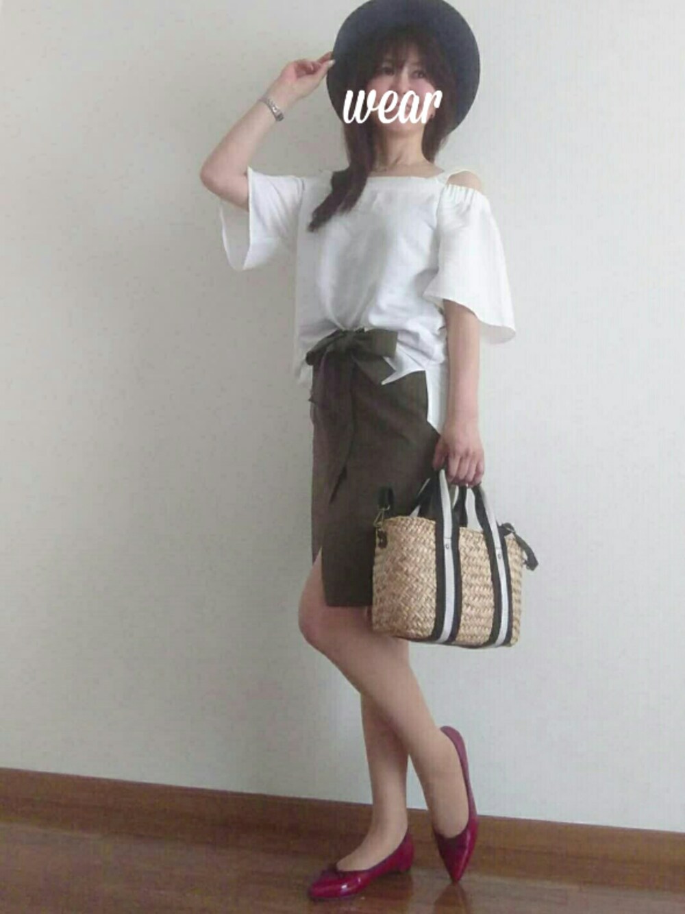 ご覧頂きありがとうございます😊💖 少し前にupしようとしたコーデ… wear不調でupできず😂😂 後 最近タイムラインバグってて… 時系列ぐちゃぐちゃになってる~😱💦 今回のコーデは一目惚れした 2wayオフショルがメイン♡ ベルト付きで着回しできるし… 袖フレアやデザインがめちゃ可愛い😍 カーキのスリットスカートは前回の イロチ買いで凄く合わせやすいです✨ そして脚元は大好き赤バレエに ネイビー夏ハットで👒 いいね save 等 いつもありがとうございます🙌💖 とっても嬉しいです♡