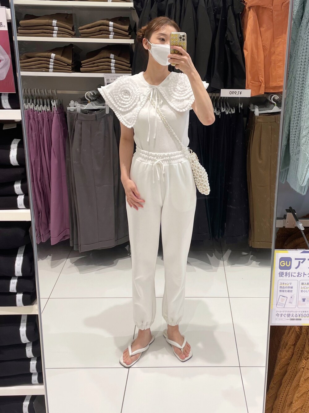 ホワイト系のスウェットパンツ、ホワイト系のサンダルを着用したレディースの秋コーディネートの1枚目の写真