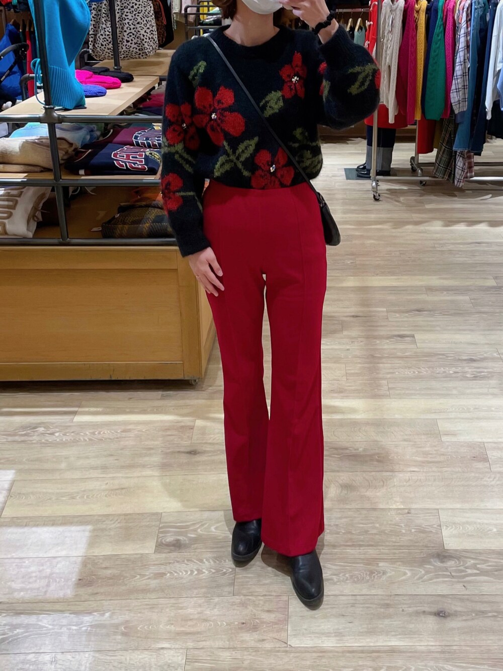 レッド系のパンツ、ブラック系のニット/セーターを着用したレディースの冬コーディネートの1枚目の写真