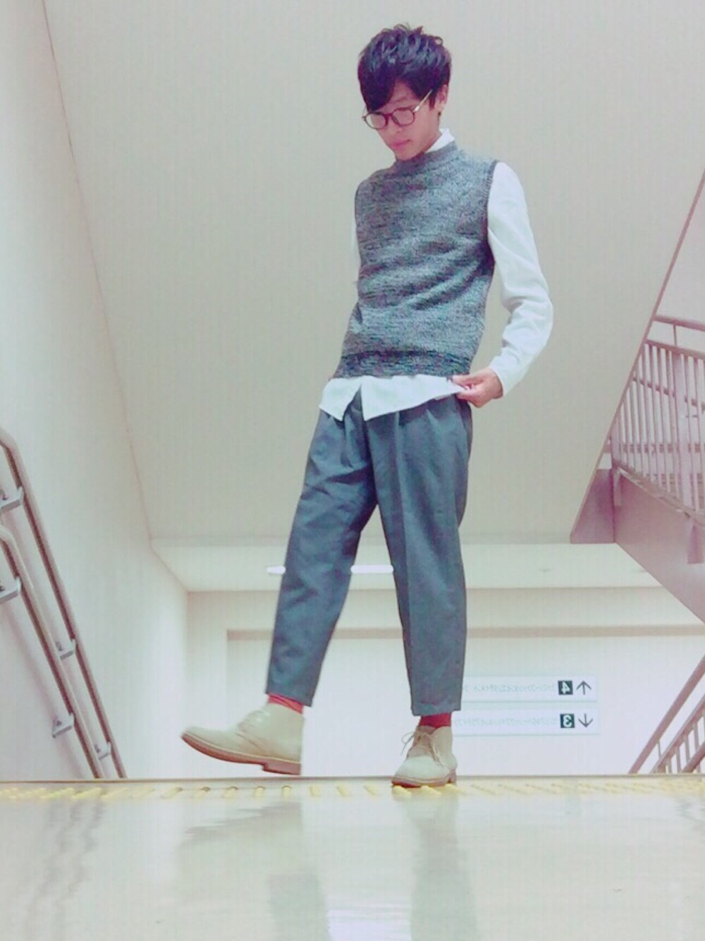 今日はニットベスト×シャツコーデ*\(^o^)/* この組み合わせは女性の方のコーデで多いのですが僕もやってみたいと思い挑戦しました😊 そしてずっと欲しかったワイドパンツを買うことができ、やっと登場させることが出来ました!!😆✨ グレー最高です✨ んで、おきまりのソックスちょい見せ😁 今回はオレンジのソックスを履いてみました👍 合わないかな〜と思ったんですけど、いい感じですかね? だんだん寒くなってきたこともあり、デザートブーツ解禁しました^ ^ フォローワーさん400人越えました!! 本当にほんとに嬉しいです😭 WEARの方々は皆さん優しくて嬉しいコメントたくさんしてくれるのでほんとに毎回コーデ載せるのが楽しみになってます✨✨ これからもよろしくお願いします☺️
