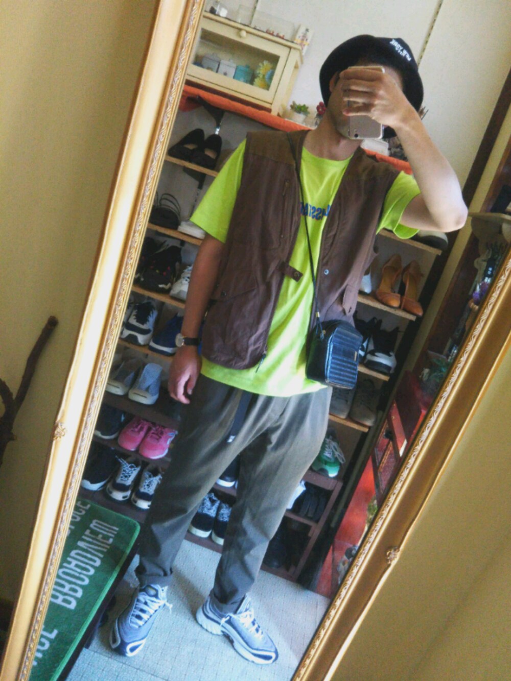 渋めのベストにネオンカラーを合わせてみました。 ReebokDMXは軽いので歩きやすいです。