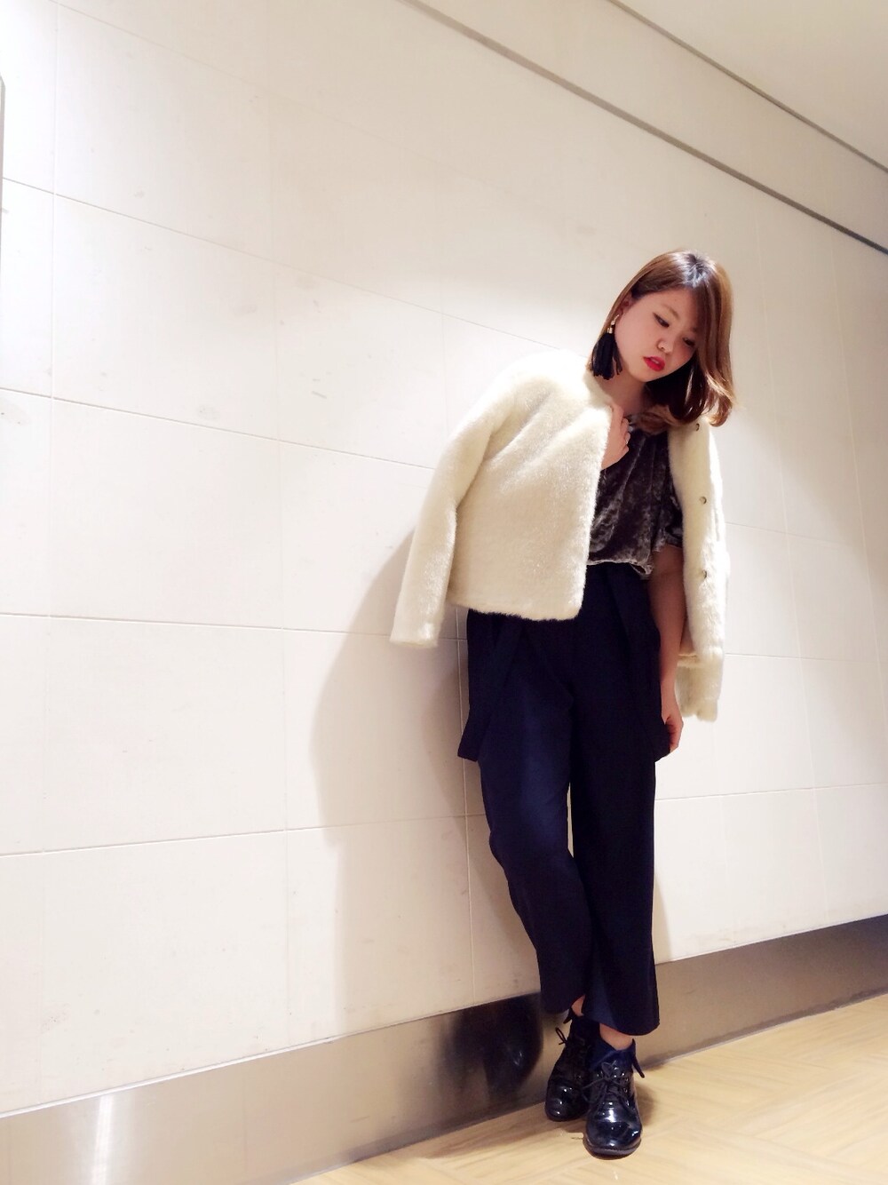 強めスタイル!シルバーのトップスにパンツを合わせてかっこいいスタイルにしました 。 きっちりしずきない格好が好きなので スラックスパンツをチョイス♪ そして、このファーコートヾ(@^∇^@)ノ 肌触りよくって形が綺麗でかわい〜〜ぃ♡ ついに店頭でラスト1つとなりました(T_T) ぜひぜひお早めにっ♪