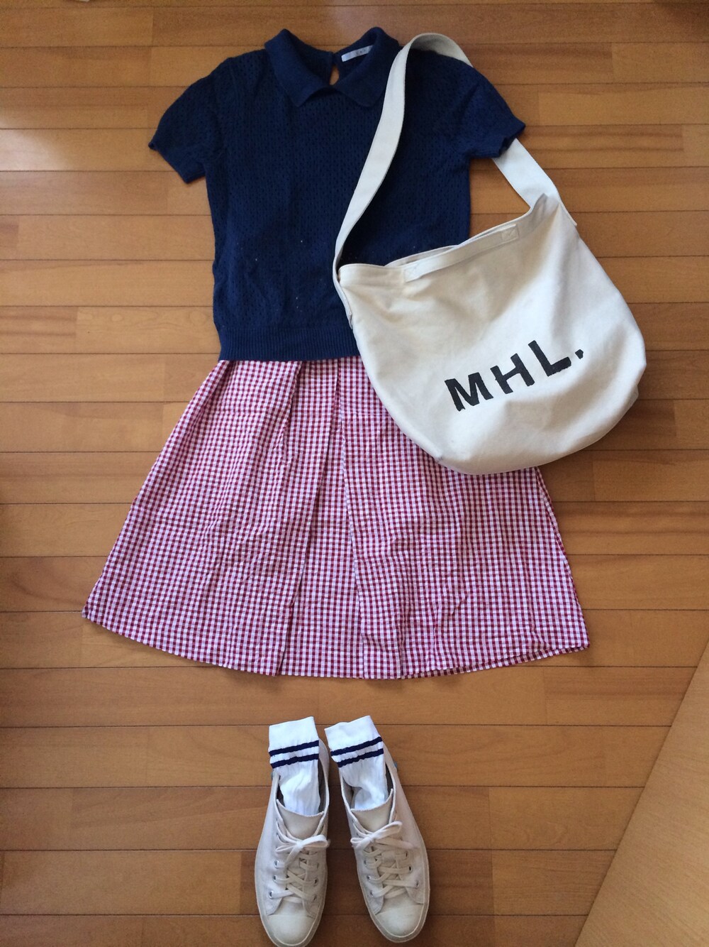 レッド系のスカート、ブルー系のニット/セーター、ホワイト系のソックス/靴下を着用したレディースの秋コーディネートの1枚目の写真