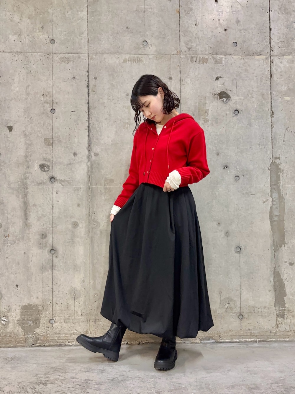 ご覧いただきありがとうございます🍀 赤のフード付きカーディガンにふんわりスカートを合わせたカジュアルガーリーコーデです👍 インナーアイテムとしてコーデュロイ生地ののシアートップスを合わせ、袖周りのくしゅくしゅ感を活かし、チラ見せさせてみました🤍インナーアイテムにバッチリ🙆♀️