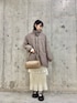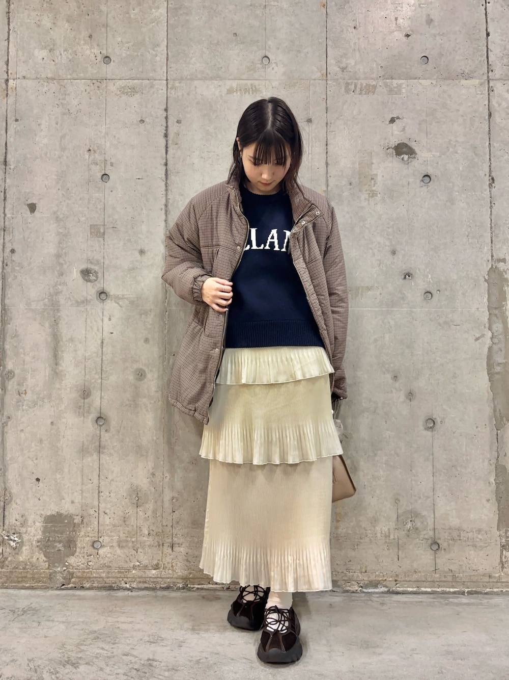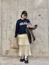 着用コーデ:61件チェックのモンスターコートは、この冬絶対持っていて損はないです!! 軽いのに暖かく、腰回りまで隠れてるのでオーバーサイズで中に着込むこともできます☀️ 白のティアードスカートにネイビーのロゴニットでカジュアルさとガーリーさを合わせて、お出かけにもぴったりです💭