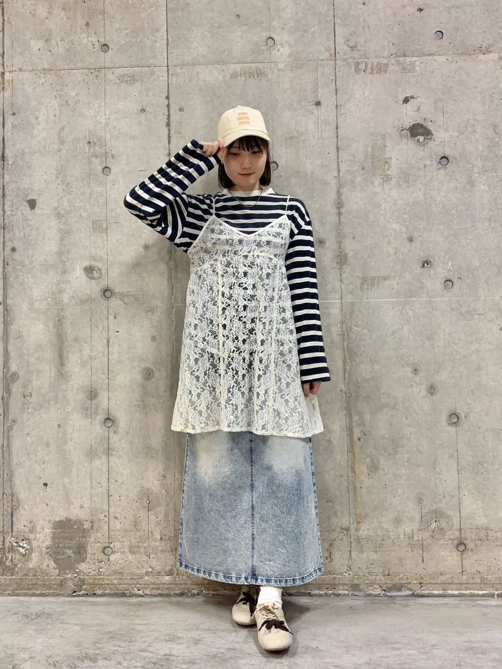 店頭人気アイテムのレースチュニックに新作アイテムを合わせてみました🌸 春新作のデニムスカートはセミフレアの形でタイトスカートよりゆとりがあり、腰回りが気になる方にもおすすめです!! 春にもおすすめベロア生地のボーダートップスは、どんなボトムスにも🙆♀️
