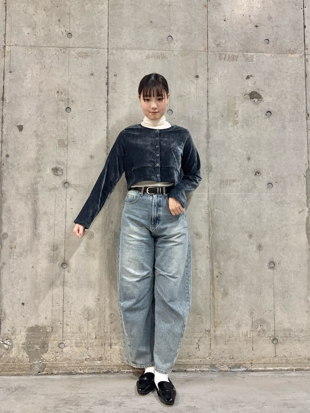 店頭人気アイテムの2セットアイテムを着回しコーデで、分けてみました! ネイビーのベロアが鮮やかで、春先にもご活用いただけます! 今回はハイネックのアイテムを中に着込み、今の時期からも着れるようにし、デニムで爽やかさをプラスしてみました✨