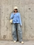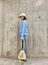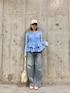 春のお出かけコーデ☘️ 水色のトップスは裾部分が可愛く、これ一枚で春おしゃれ完璧です✨ デニムやベージュのアイテムとまとめ、靴にワンポイントでスタッズ付きのおしゃれなアイテムで、ガーリーすぎずカジュアルすぎず!