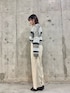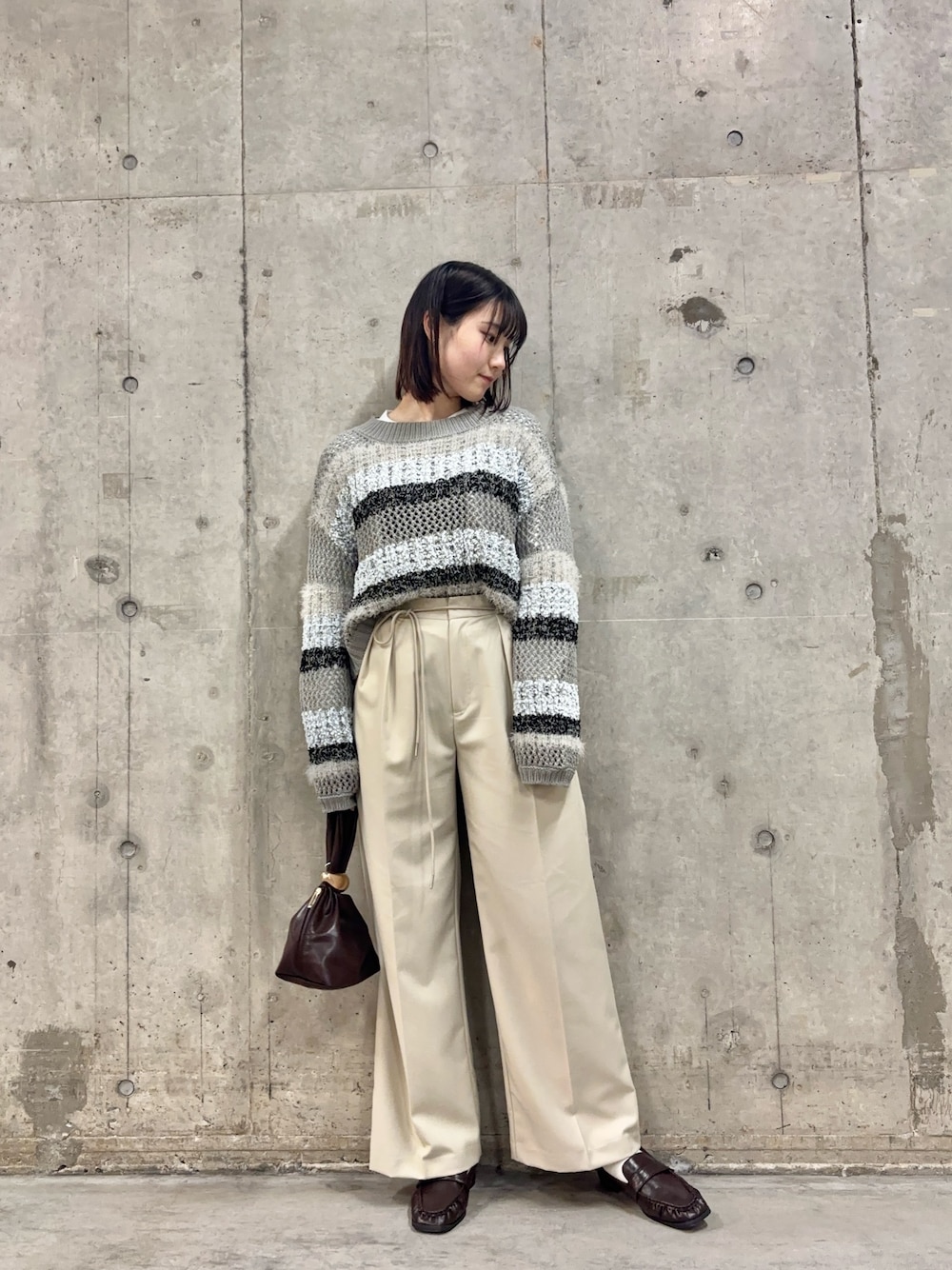 グレーのボーダーニットは今の時期から着用できるアイテムです!私はインナーにロゴ入りロングTシャツを合わせましたが、インナーにシャツやタートルネックニットを合わせるのも🙆♀️ 今回はコードベルトがワンアクセントになるベージュパンツを合わせました! シンプルすぎず、着回しがしやすいアイテムで、165cmの身長でもMサイズで丈感もぴったりでした🙌🏻