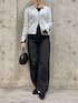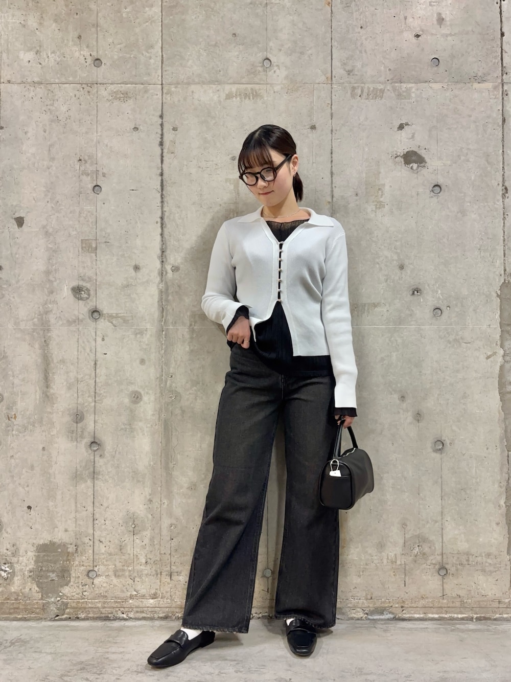 メタルボタンの可愛い襟付きカーディガンに、通年でインナーとしても使えるシアートップスを合わせたコーデです!! 今流行りのレイヤードで、シンプルなアイテムを華やかにできます🙆♀️ シルエット盛れができる黒のストレートデニムと合わせ、大人きれいめに少しカジュアルさをプラス🙌🏻