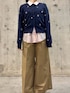 春カラー満載のコーデです🎀 ピンクシャツを裾と襟から出すと、縦にサラッと見えやすく、カラーで華やかに! ピンクとネイビーの相性よく、花刺繍の可愛いカーディガンは一枚でも着れ、今の時期から🙌🏻 定番人気アイデムのバギーチノパンは、履き心地も温度感も🙆♀️なので、通年して着用いただけます!