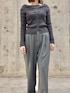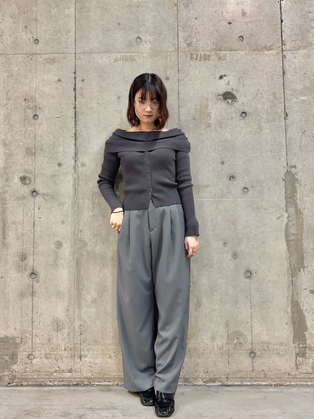 グレーコーデ🩶 Skinproofのオフショルセーターは高見栄です!!店頭人気アイテムオフショルセーターは防花粉と、春にもってこいアイテムです☘️ ツータックスラックスはウエストにタックが入っているので、足長効果!そして、ひんやりした触り心地で、速乾性もあるので着回しに🙌🏻
