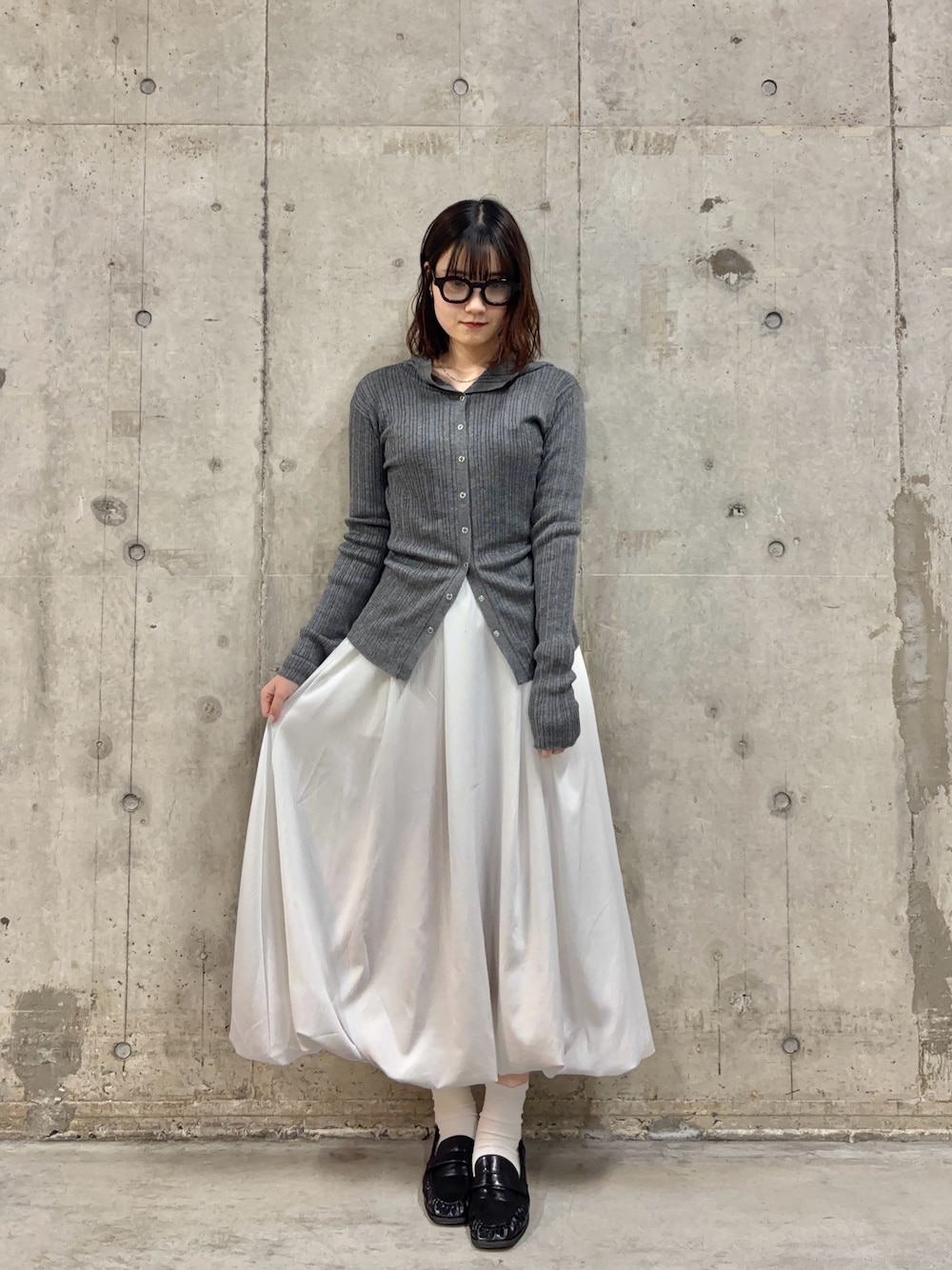 定番人気アイテムのスカートにカジュアルさをプラス🩶 グレーのリブ付きのトップスはなんといっても着心地抜群!身体にフィットしつつ、ストレッチが効いています!! カジュアルになりやすいフーディー付きアイテムに店頭人気なローファーや、通年で着用できるふんわりシルエットの可愛いバルーンスカートと合わせ、甘めカジュアルに💭✨