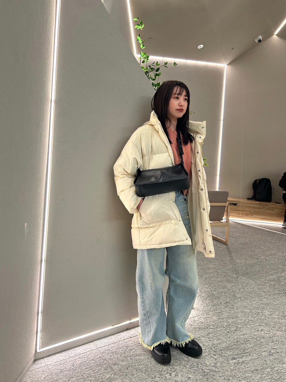 寒くて、去年着てた白ダウンを♡ ピンクのニットで、 少しだけ気分も暖かくします!