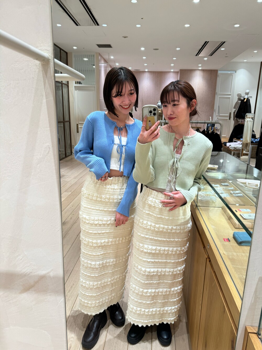 甘すぎないけど、 女っぽいGreen服🍃 ラメも入っててキラキラ可愛いですよ! しかも前後2way☺️🌼 #ラメリボンカーディガン ¥7,920(税込) 合わせてる、 #ジャガードカットタイトスカート も大人気です💚
