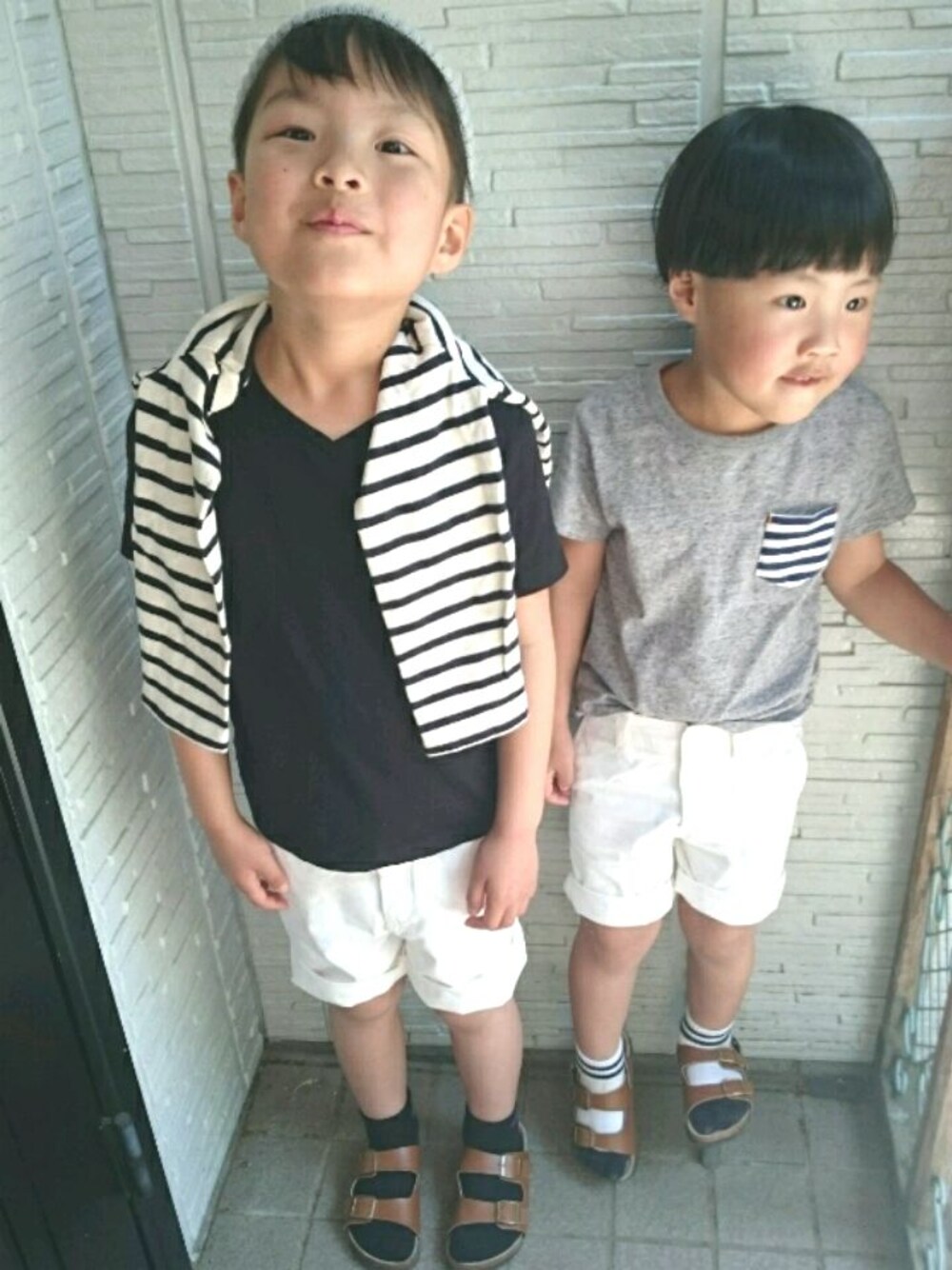 ホワイト系のTシャツ/カットソー、ホワイト系のその他パンツを着用したキッズの秋コーディネートの1枚目の写真
