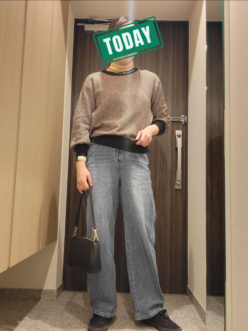 黒バッグの使い勝手のよさ… カジュアルな上下なのでバッグやアクセでキレイ目を足しました。