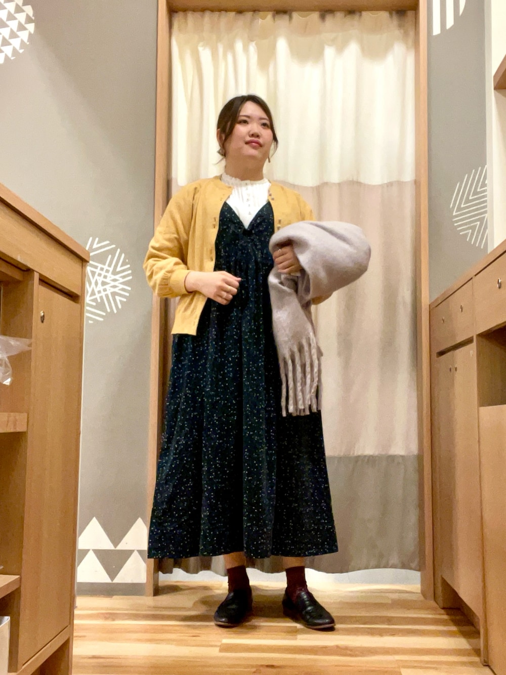 【ゆべし×Samansa Mos2】コラボの ワンピースを着てみました🌷 ワンピースは細畝コーデュロイ生地とは思えない軽さに驚き…!華やかなチューリップ柄と相まって自然と心躍る着心地です♩ 編み上げデザインは首元をスッキリ見せてくれるので、丸顔さん・骨スト民大歓喜です🎉 写真2枚目のようにカーディガンを閉じると、エレガントなスカートコーデに大変身してくれます✨ 店頭にてノベルティお配りしております、お待ちしております!