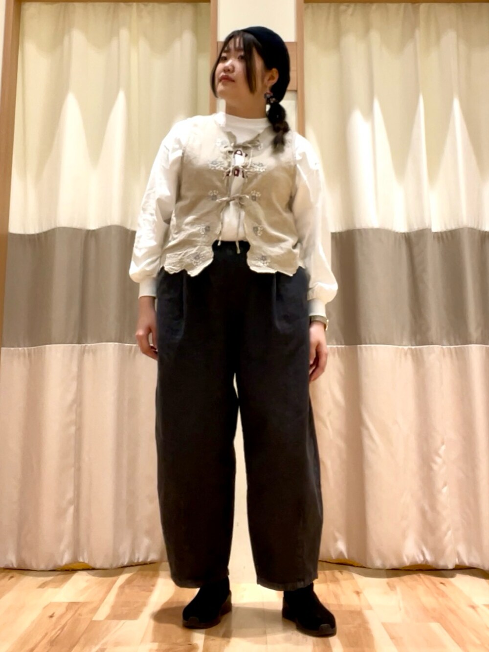 ベージュのベストはお花の刺繍がさりげないので甘くなり過ぎないのが個人的推しポイント🫶 生地が柔らかい&軽いのでこれからの季節大活躍の予感❣️ 今回のベスト、ガーリー初挑戦したいという方にとってもおすすめです☺︎🎊 店頭では一部のお色が売り切れもあったり 大人気となっております!